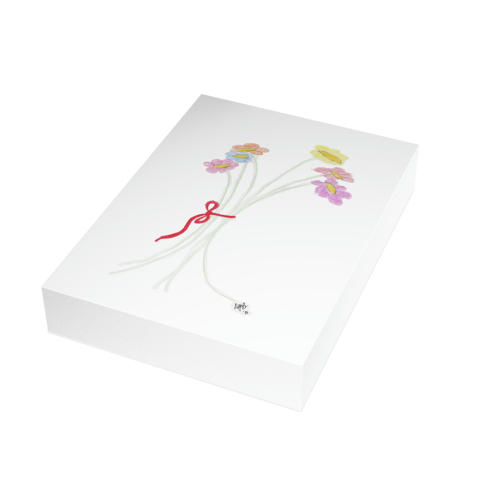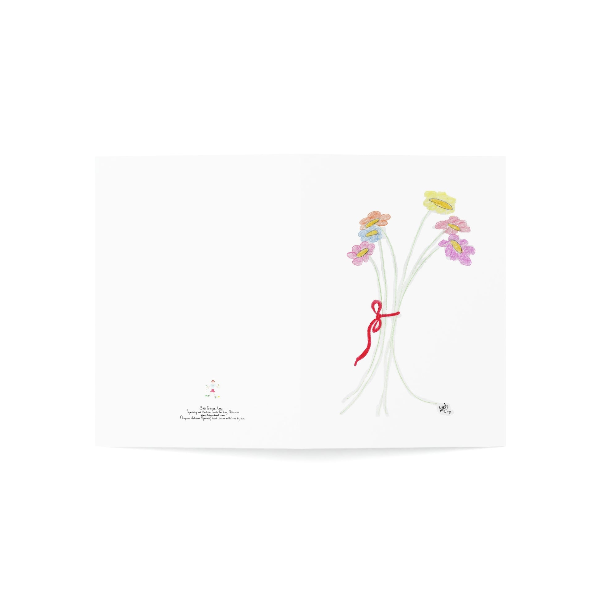 5x7 portrait greeting card – Sending a Bouquet to Brighten Your Day - A bouquet of long stemmed cheery flowers tied with a red ribbon. I was asked to draw several cards that someone could send to an elderly relative. The recipient appreciated the simple drawings and messages. This is a great card to send to reach out to someone who needs cheering up, encouragement, or just to say hi. Original drawing is colored pencil on paper, scanned in and placed on the card.