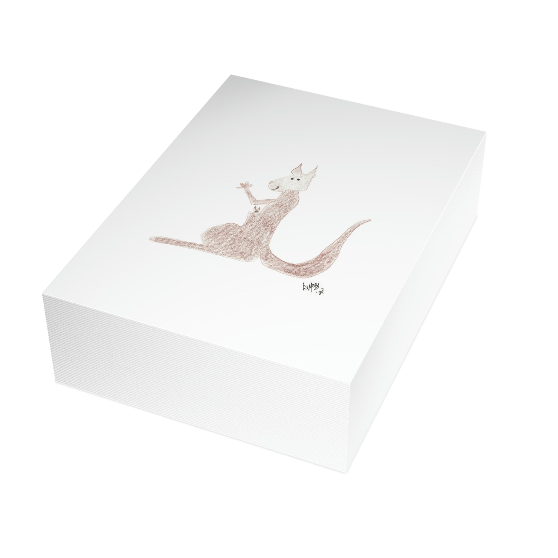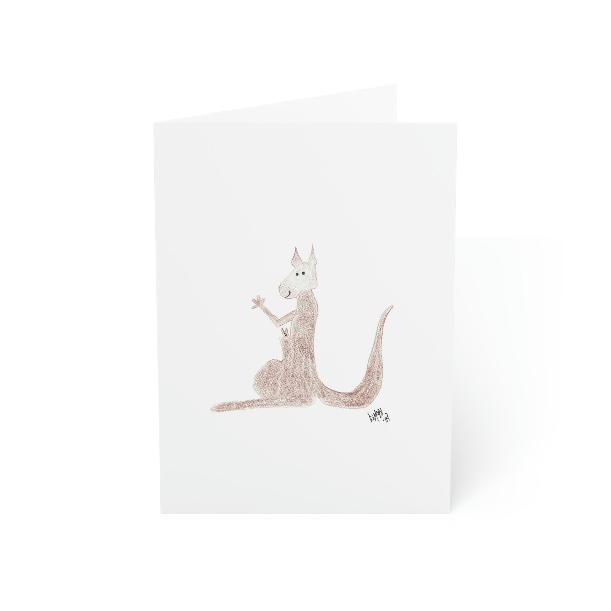 5x7 portrait greeting card – What's Hoppening? A kangaroo and her joey bounce in to find out what's up! Send a fun little "g'day," to a mate that needs a lift. Perhaps they need to bounce back from disappointment - what better than a kangaroo (two, in fact) to accomplish that? Original drawing is colored pencil on paper, scanned in and placed on the card.
