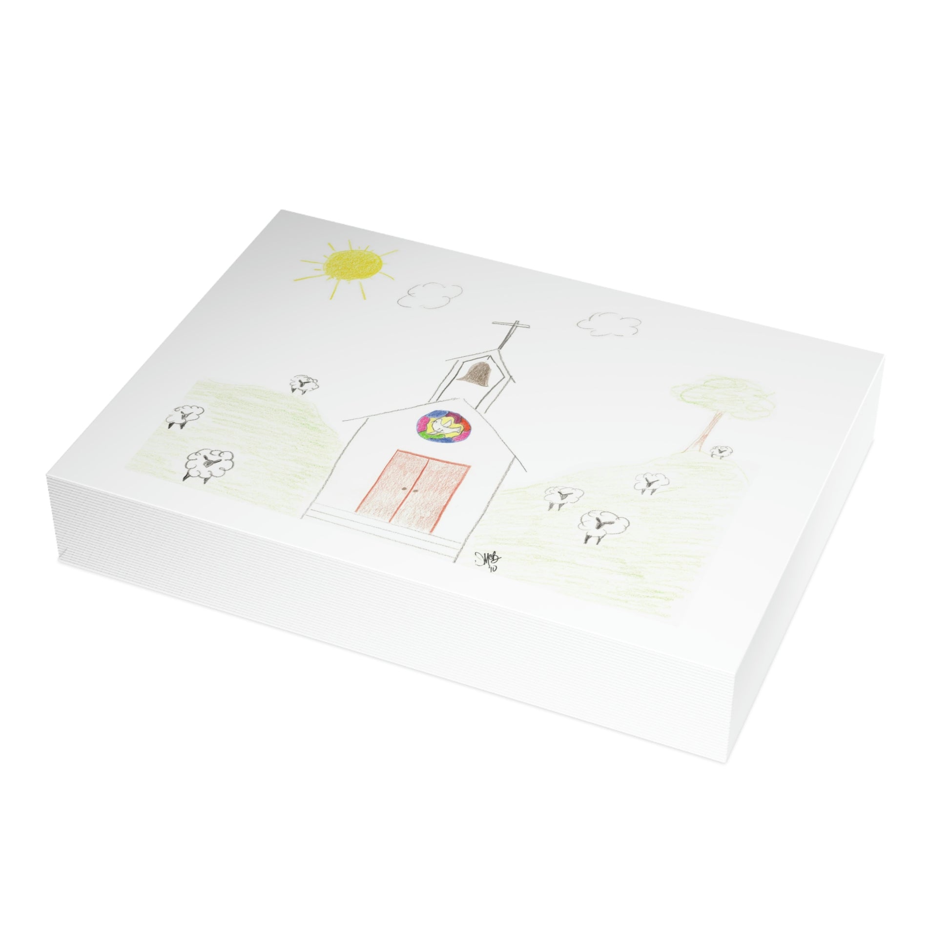 5x7 landscape greeting card – We Welcome Ewe to Our Flock - Sheep scattered on a bucolic hillside with a cute little church as the center of the card. A friend asked me to draw this card for her to use to welcome new parishioners into their church. I think it's cute enough to include in the collection. It can be used for other occasions, but the church kind of makes it specific. Original drawing is colored pencil on paper, scanned in and placed on the card.